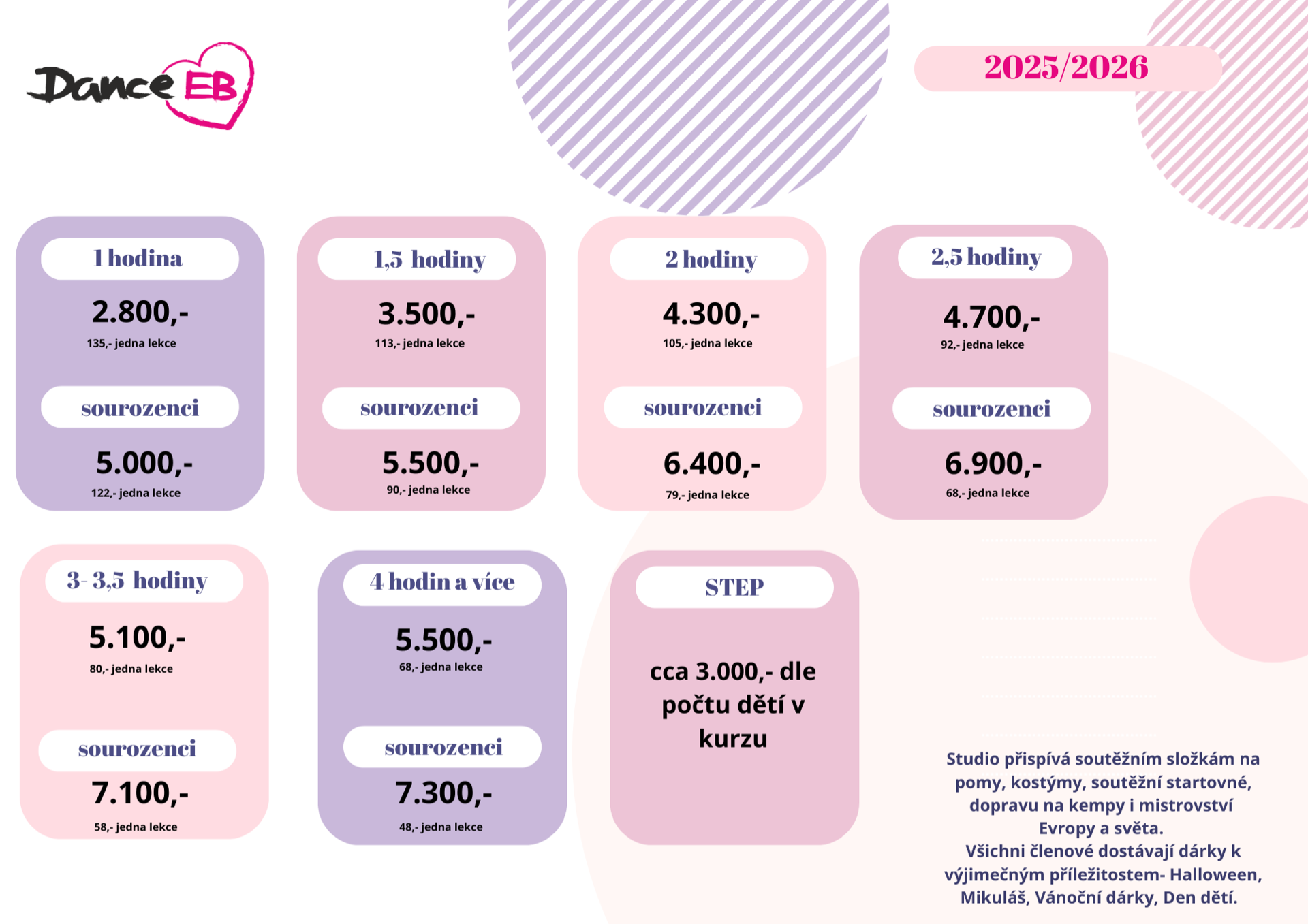 Kurzovné se odvíjí od počtu odchozených hodin v týdnu. Studio nabízí několik tanečních lekcí a naši členové toho plně využívají. Ceny níže jsou uvedeny za jedno pololetí.