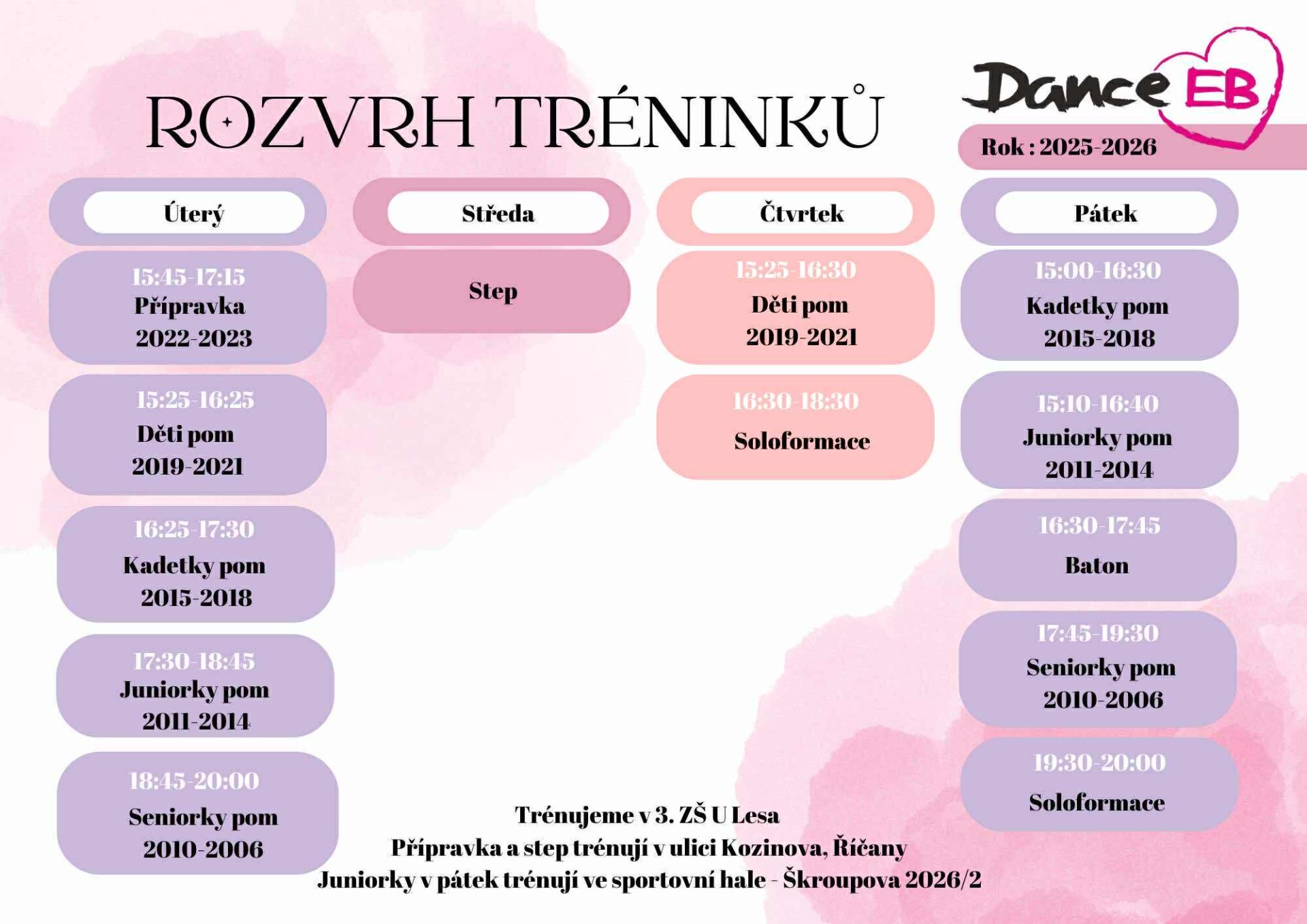 Všechny tréninky probíhají v 3.ZŠ U Lesa. Stepování a přípravka nejmenších v ulici Kozinova, Říčany.